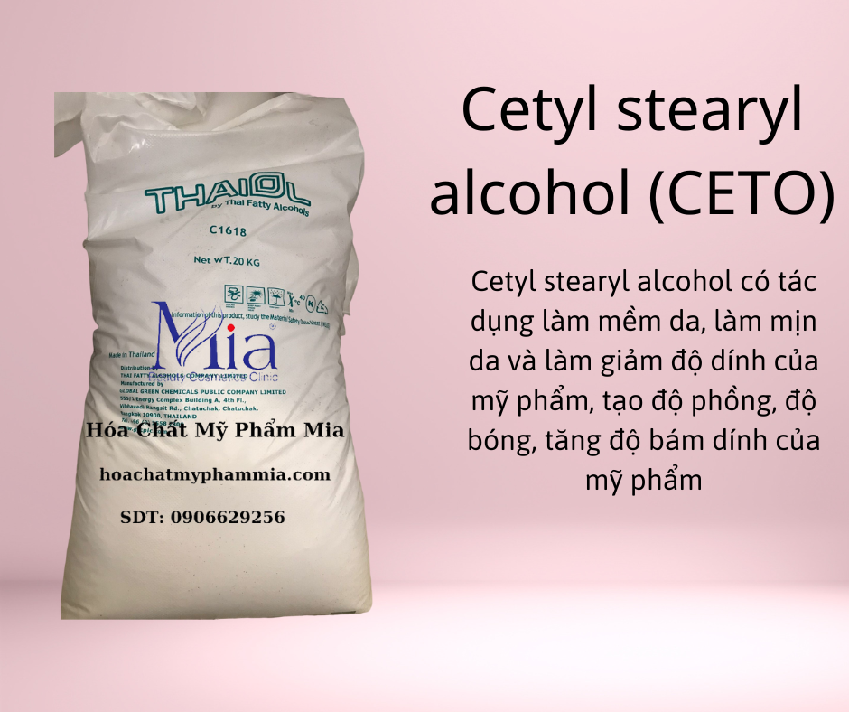 Ceto stearyl Alcohol là một hợp chất được tìm thấy trong chất sáp có nguồn gốc từ thực vật và động vật. Có công dụng chất làm mềm, chất ổn định và làm dày, được sử dụng trong các chất hoạt động bề mặt để tăng cường khả năng tạo bọt và làm sạch trong các chất tẩy rửa, tạo độ cứng cho sản phẩm