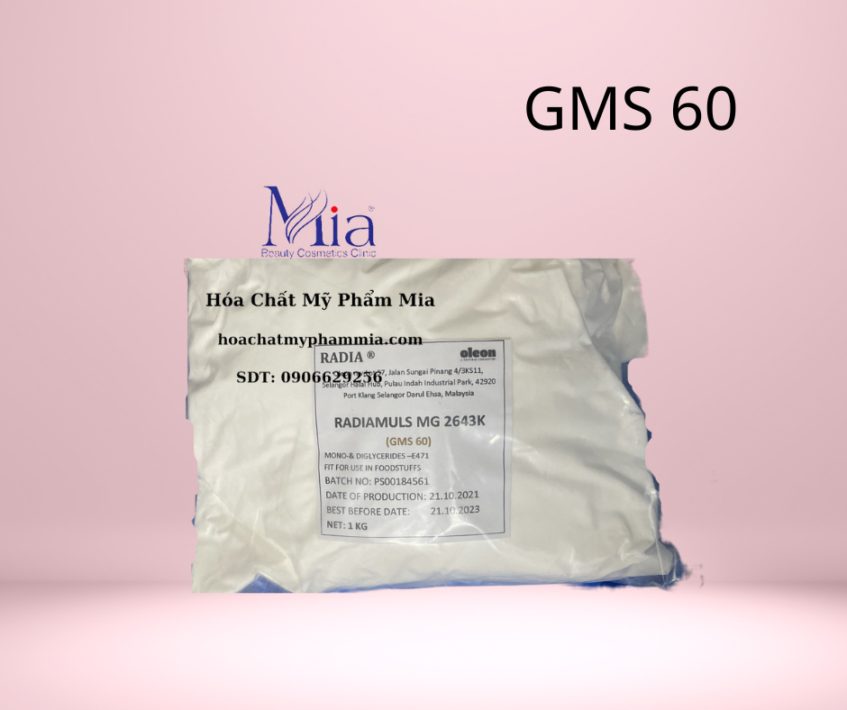 - GMS 60 được sử dụng như chất trợ nhũ hoá, chất làm đặc và đôi khi cũng có thể dùng làm chất nhũ hóa chính trong các loại mỹ phẩm hiện nay. Nó chẳng những không gây dính nhớp mà còn làm giảm nhờn trên da, khô thoáng và mềm mịn bề mặt da, đây là điều mà các loại sáp nhũ hoá khác không làm được.